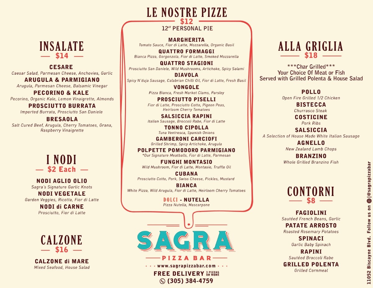 Welcome to Sagra Pizza Bar, a charming culinary gem located at 11052 Biscayne Blvd, Miami. Here, you’re invited to indulge in authentic Roman-style thin-crust pizzas, lovingly baked in an Italian-imported Valoriani wood-fired oven. This meticulous cooking method reaches 700°F, ensuring a perfectly crispy crust that serves as a foundation for delectable toppings.
